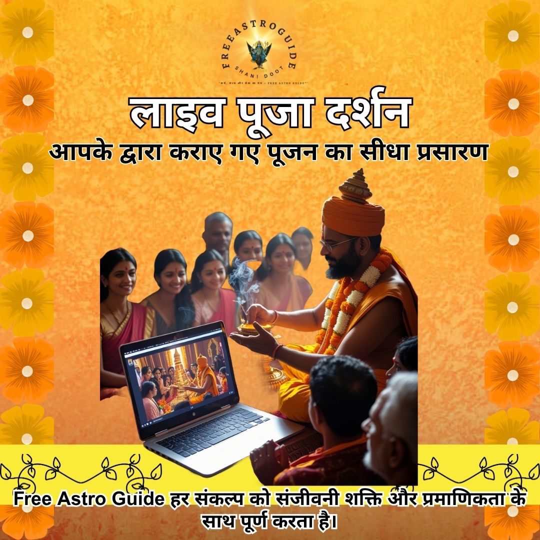 🙏 Free Astro Guide की यह अनोखी सेवा आपके द्वारा कराए गए प्रत्येक संकल्प पूजन, यज्ञ, रुद्राभिषेक, शनि शांति, राहु-केतु निवारण, ज्योतिर्लिंग अभिषेक आदि का Live या Recorded Video Proof दिखाने का माध्यम है।
