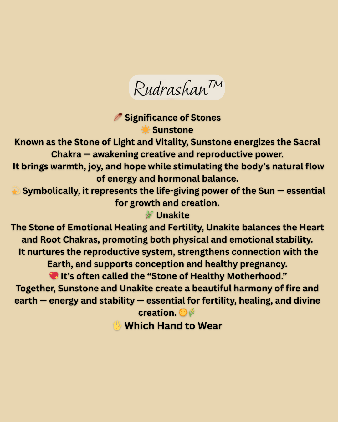 The Rudrashan™ Bracelet for Prajanan Saubhagya Bracelet is a sacred union of two deeply nurturing gemstones — Sunstone and Unakite — carefully chosen to balance feminine energy, regulate emotional flow, and awaken the body’s creative rhythm.